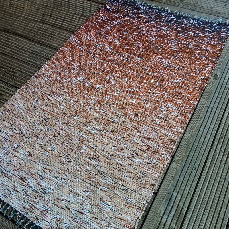 No diegiem / dzijas austs paklājs ar pāreju no tumši brūna uz gaiši smilšainu. Izmērs : 1,25 m x 0,73 m. Var saudzīgi mazgāt.