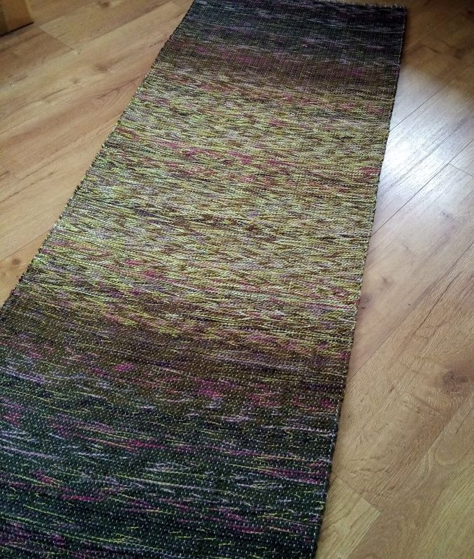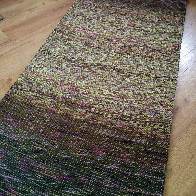 No krāsainiem diegiem austs grīdas celiņš vai dīvāna pārklājs kā daļiņa no dabas Jūsu interjerā. Izmērs : 1,98 m x 0,73 m. Materiāls ir viegls, bet izturīgs, kā arī viegli kopjams – piemērots saudzīgai mazgāšanai. Šis roku darbs ir radīts no otrreiz pārstrādāta tekstila, diegiem un dzijas, apvienojot ilgtspēju, estētiku un praktiskumu. #Grīdas_celiņš #austs_grīdas_celiņš #pārstrādāts_materiāls #dizaina_paklājs