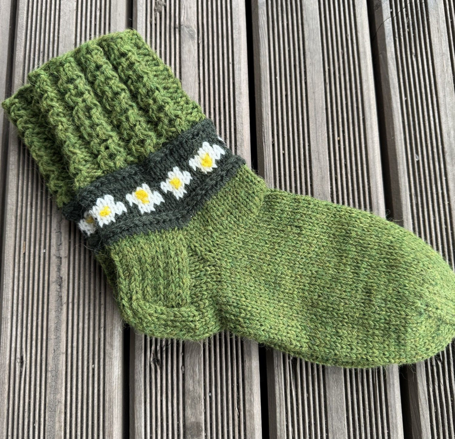 Materiāli: Drops vilnas dzija (70% aitu un alpaku dzija, 30% poliamīds). Margrietiņu dzeltenās actiņas - izšūtas.