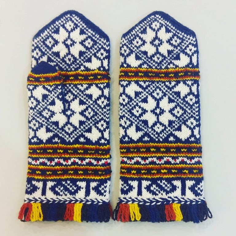 Ar rokām adīti etnogrāfiski cimdi no 100% vilnas. Standarta viens izmērs uz sieviešu roku.
