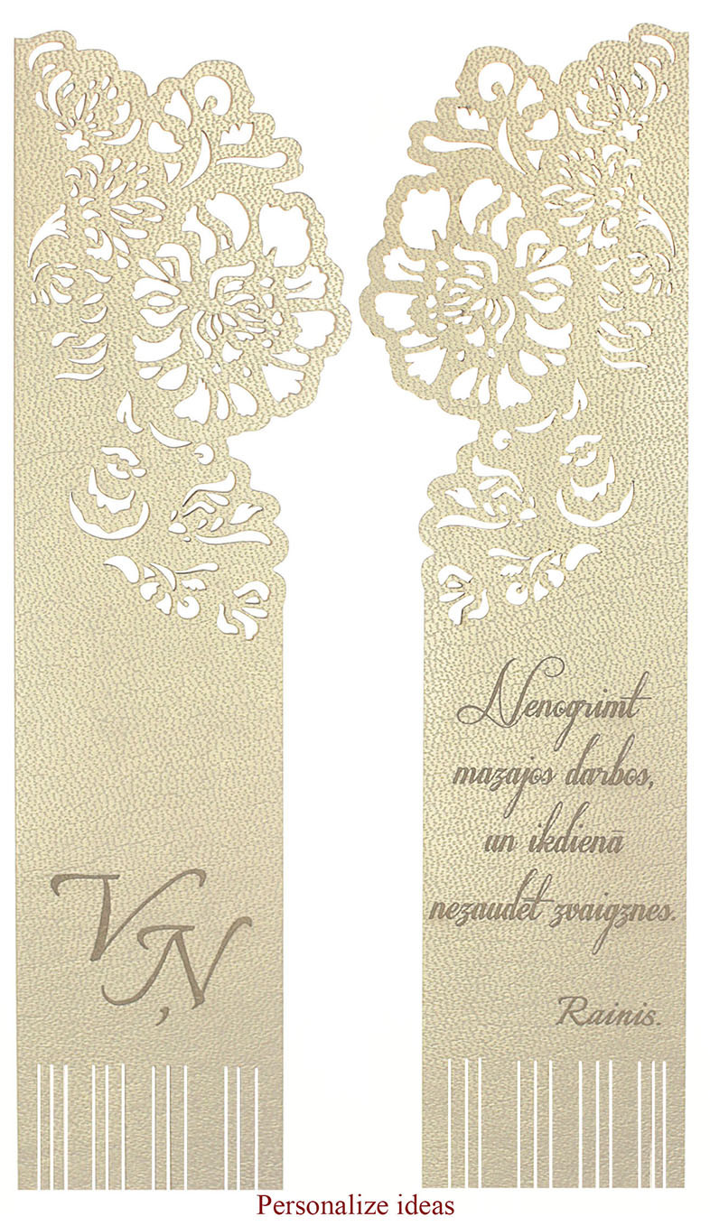 MATERIĀLS: Āda (Itālijā ražota)IZMĒRS: Augstums 18 cmDIZAINS: Lāzera griezuma ziedu un koku motīvi. Iespējams personalizēt, iegravēt iniciāļus vai vārdu. Pieejami dažādi motīvi, bildēs redzami motīvi "Kastaņlapa", "Taureņi", “Veronika” un "Koki". Mūsu katalogā pieejami pie 200 dizainiem.IEPAKOJUMS: Tiek iepakota pašu ražotajā papīra iepakojumā. Iespējams pasūtīt iepakojumu ar personalizētu novēlējumu.KRĀSA: Dizains piejams virs 50 ādas krāsu toņos.