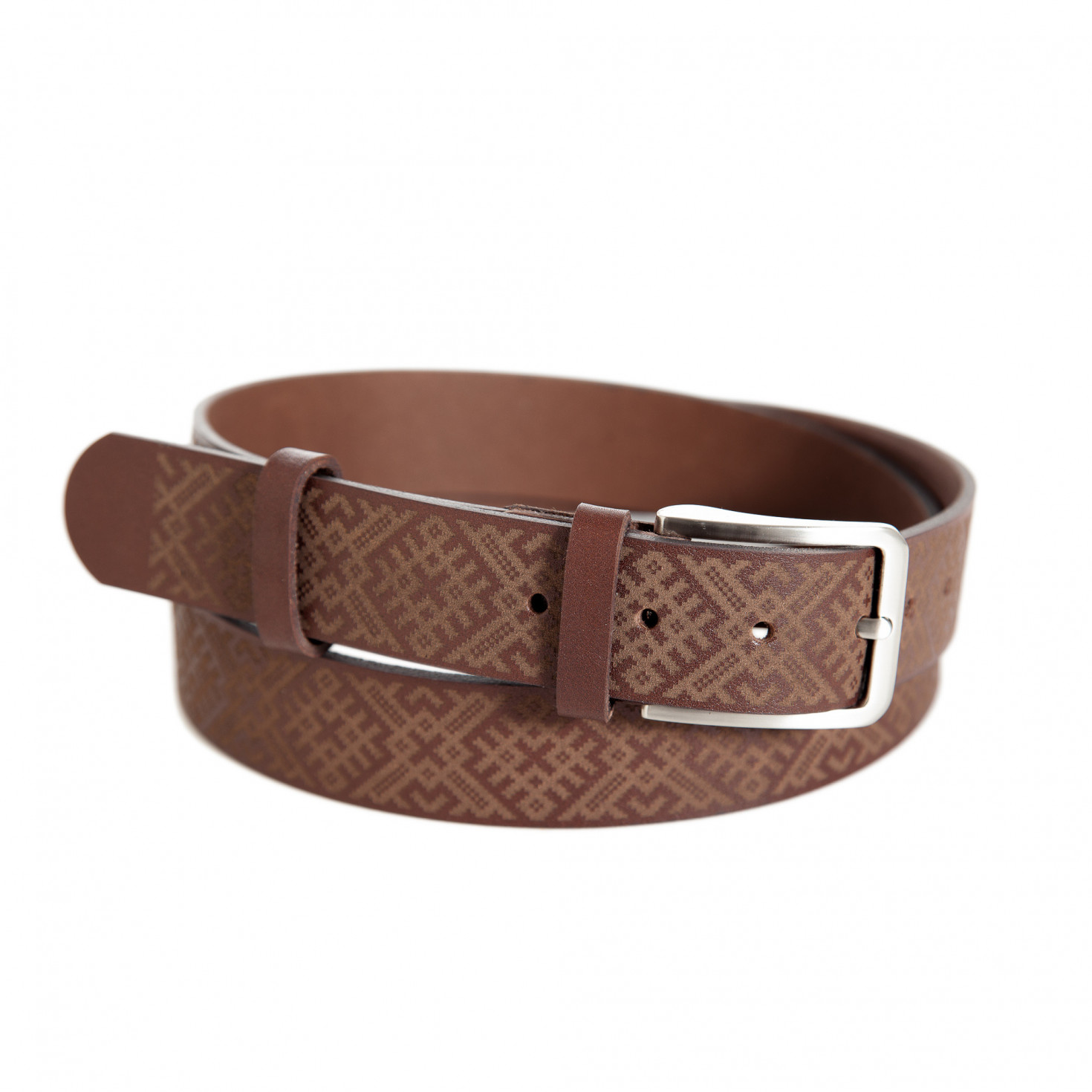 Gaiši brūna ādas josta ar ugunskrusta rakstu. Metāla sprādze. Jostas platums 35 mm. Ādas biezums 3,7 mm. Lieliski derēs pie klasiska stila apģērba vai arī pie džinsa biksēm. Jostas garumu piemērosim tieši Jums! Roku darbs. Radīts Latvijā. Ienāc e-veikalā