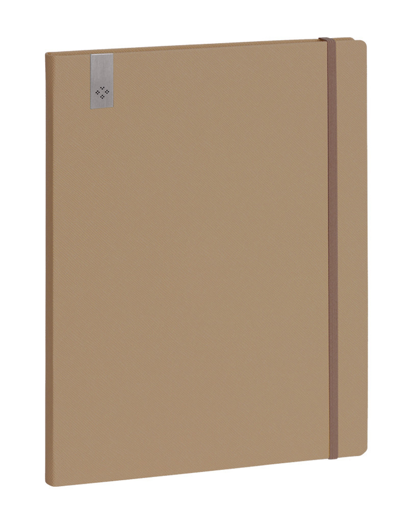 CIETĀ SĒJUMA GRĀMATA, ĀDAS IMITĀCIJAS MATERIĀLS AR FAKTŪRU, IESTRĀDĀTA TONĒTA METĀLA PLĀKSNĪTE, DIZAINA PAPĪRA PRIEKŠLAPAS, GUMIJAS AIZDARE, APAĻOTI STŪRI, ŠĶĪRĒJLENTA. IZMĒRS - 190 X 254 MM IEKŠLAPAS: RŪTIŅAS / SKUJIŅAS / BALTAS PAPĪRS - MUNKEN LYNX 90 G/M2 VĀKS - SINTĒTISKS MATERIĀLS