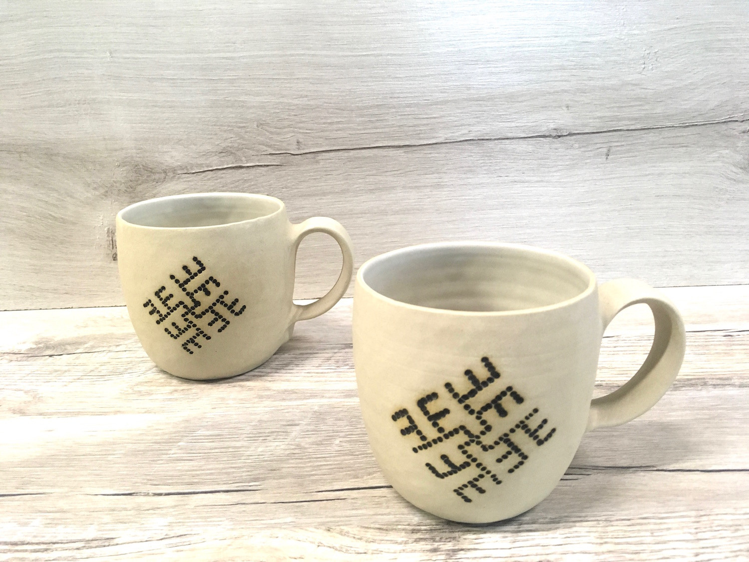 Veidota ar rokām uz podnieka ripas no baltās akmens masas. Apdedzināšanas temperatūra - 1250°C. Dekorēta gravēšanas tehnikā, izmantojot latvju rakstu zīmju motīvus. Ugunskrusts - radīšanas, auglības un mājas svētības simbols. Stiprina mērķapziņu, vēlmi enerģiski darboties, atraisa radošās spējas, veicina iedvesmu. Krūzes iekšpuse glazēta ar caurspīdīgi matētu glazūru. Izmantotā glazūra ir videi un cilvēka veselībai draudzīga bez kaitīgiem piemaisījumiem. Drīkst lietot mikroviļņu krāsnī, mazgāt trauku mazgājamajā mašīnā. Izmēri: Diametrs- 10 cm Augstums - 9.5 cm Tilpums - 0.4L Svars: 0,3kg