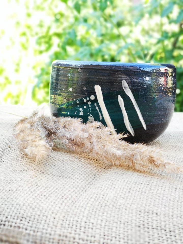 Bļoda "Jāņu nakts" kolekcija. Tumši zila ar baltiem un ziliem akcentiem. Augstums - 8 cm Platims atvērumā - 11,5 cm