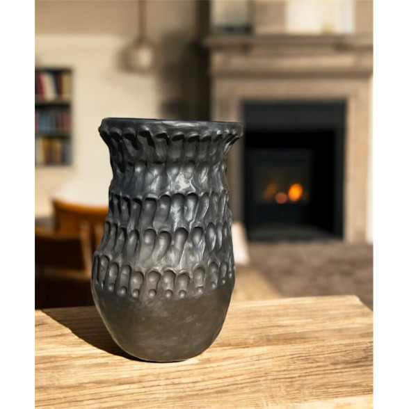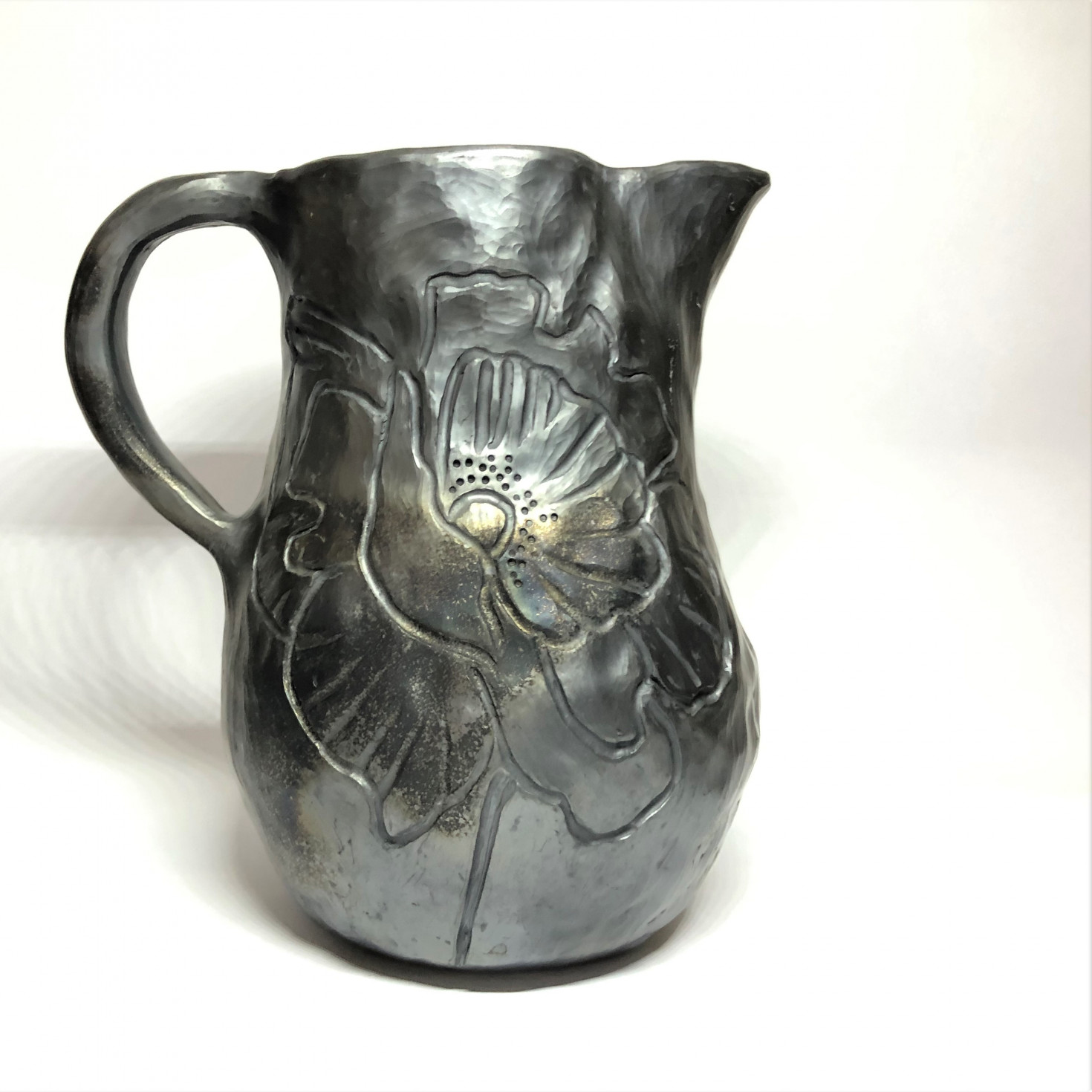Apdedzināts un svēpēts bedres tipa malkas ceplī, kā rezultātā iegūta melni sudrabotā nokrāsa un trauks ieguvis karstumizturību.