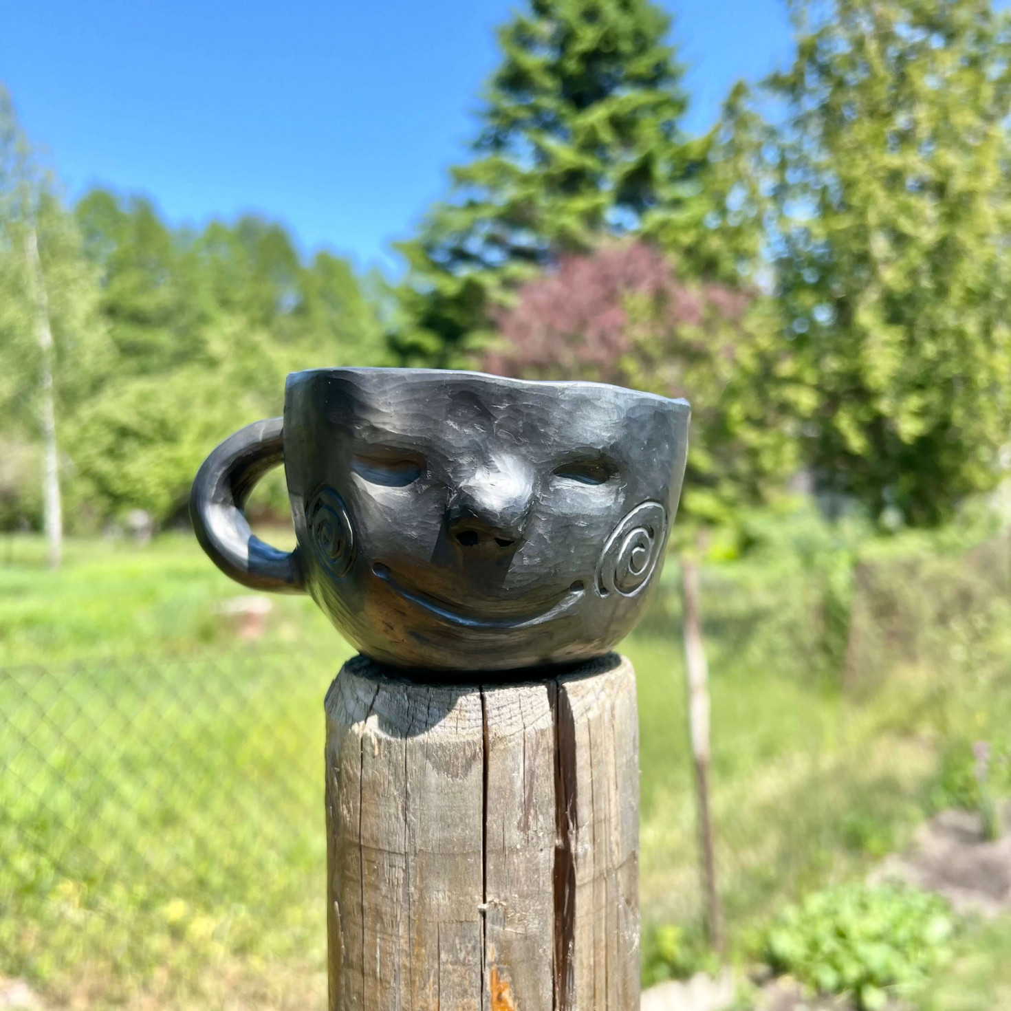 Melnās, ar rokām darinātās, keramikas krūze, kurai pieskaroties ir jāaizver acis un jābauda mirklis!