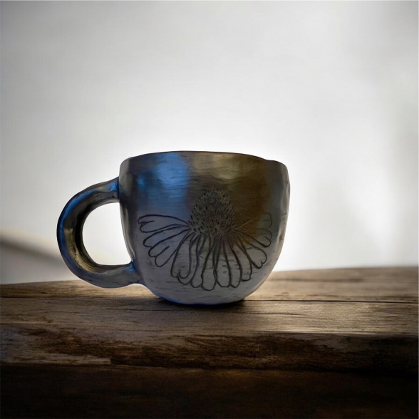 Apdedzināts un svēpēts bedres tipa malkas ceplī, kā rezultātā iegūta melni sudrabotā nokrāsa un trauks ieguvis karstumizturību.