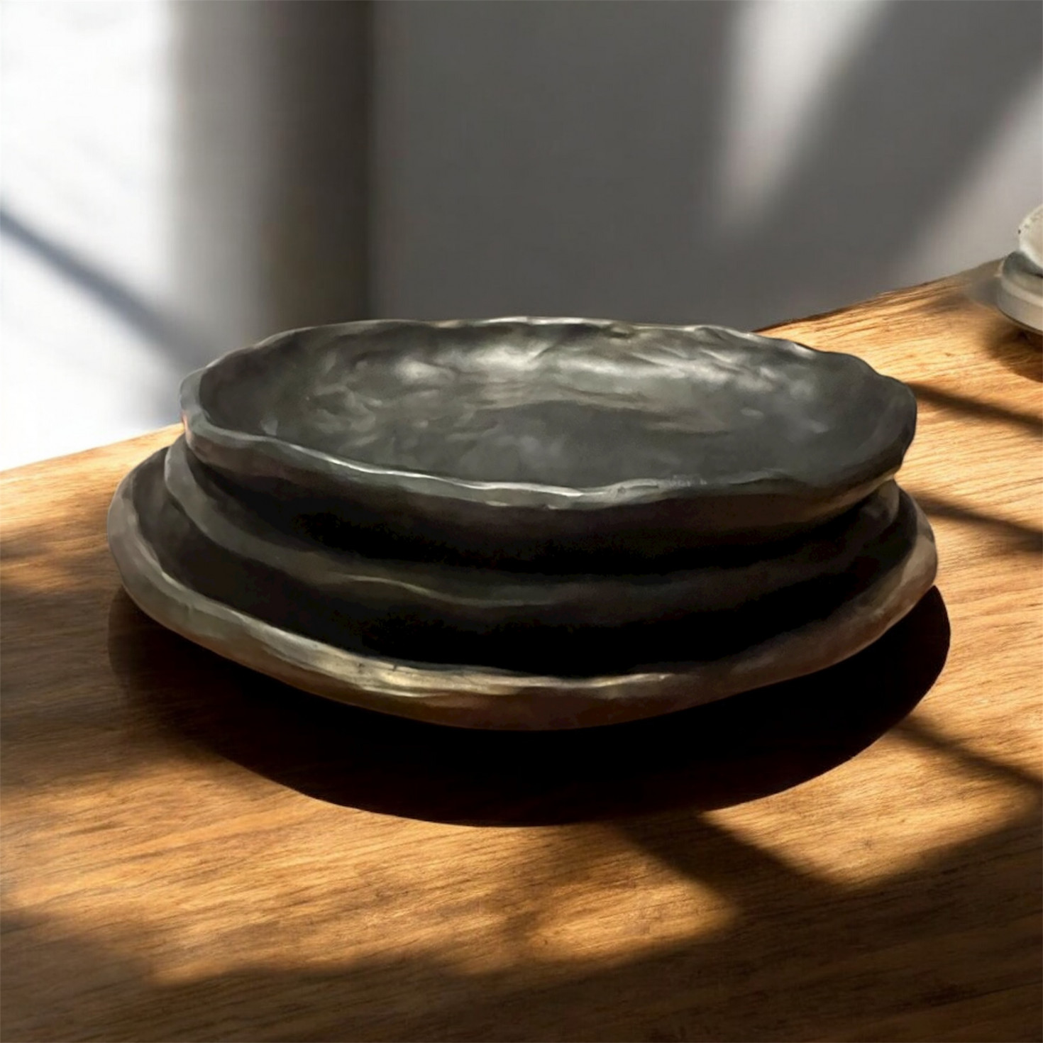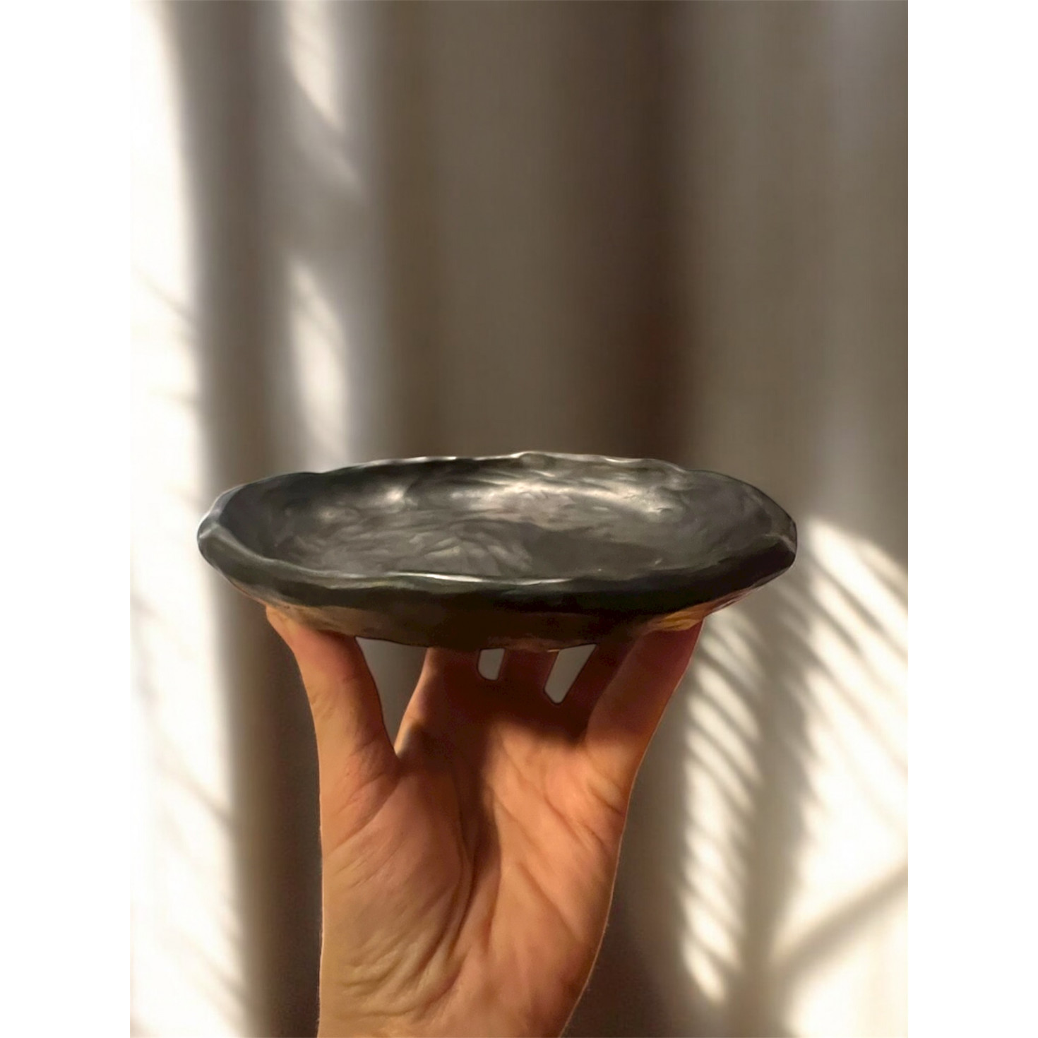 Apdedzināts un svēpēts bedres tipa malkas ceplī, kā rezultātā iegūta melni sudrabotā nokrāsa un trauks ieguvis karstumizturību.