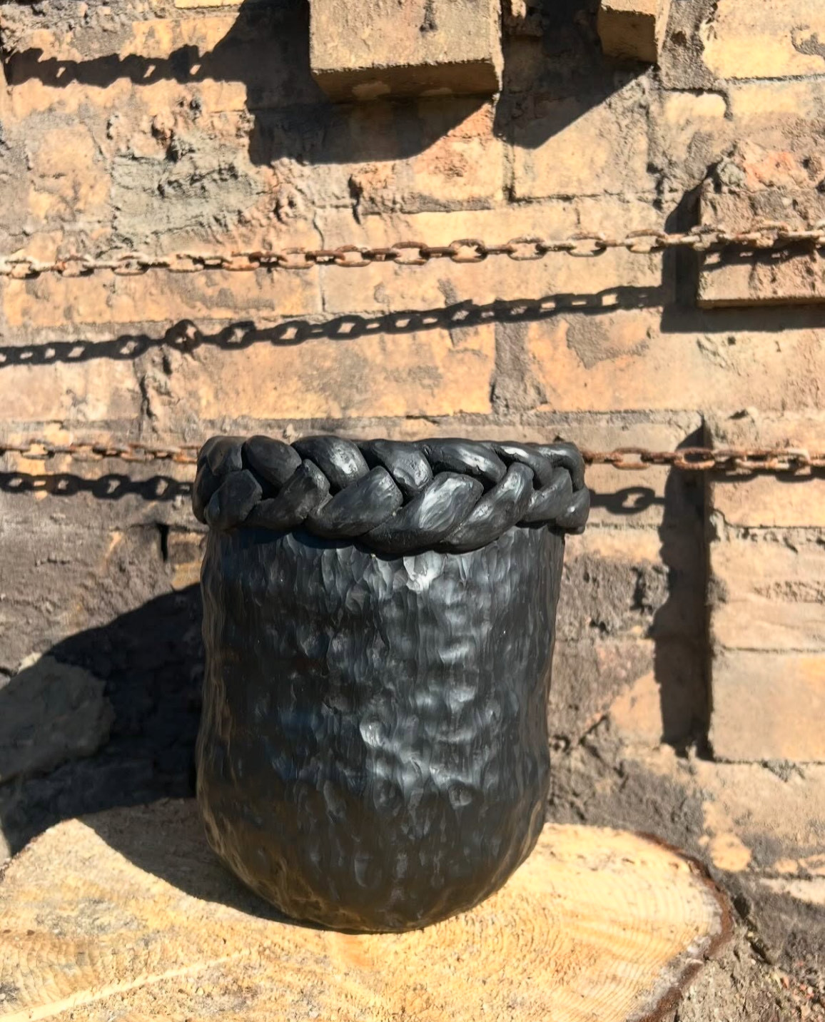 Apdedzināts un svēpēts bedres tipa malkas ceplī, kā rezultātā iegūta melni sudrabotā nokrāsa un trauks ieguvis karstumizturību.