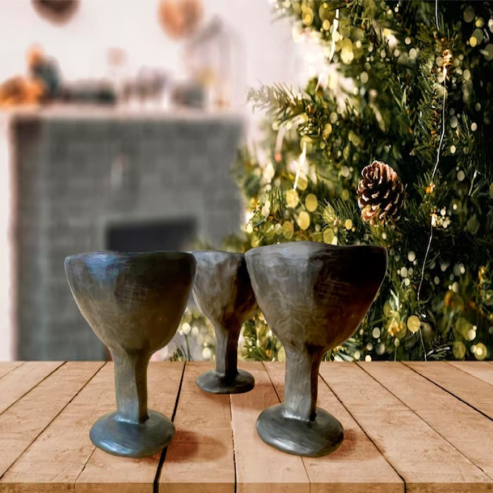 Apdedzināts un svēpēts bedres tipa malkas ceplī, kā rezultātā iegūta melni sudrabotā nokrāsa un trauks ieguvis karstumizturību.