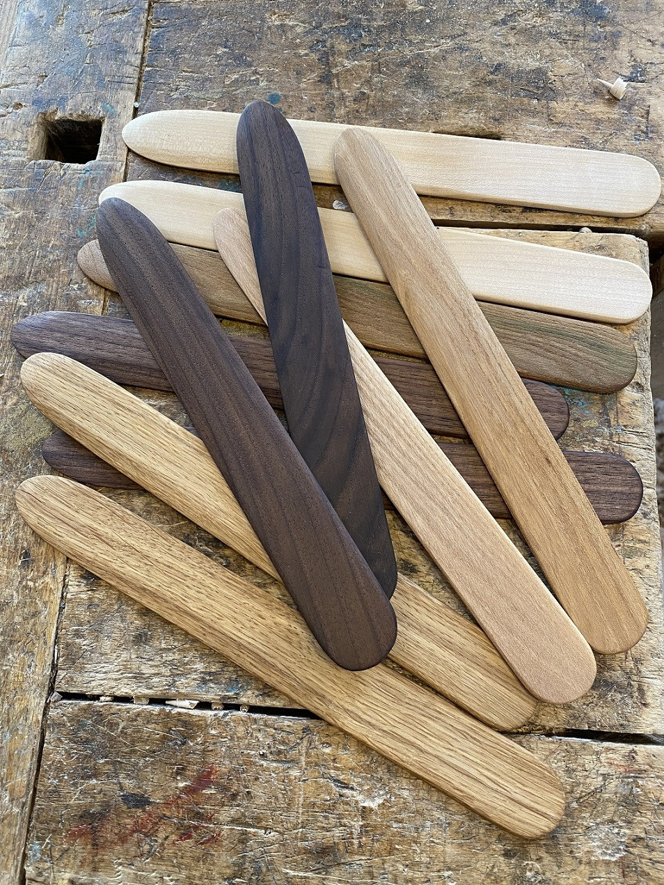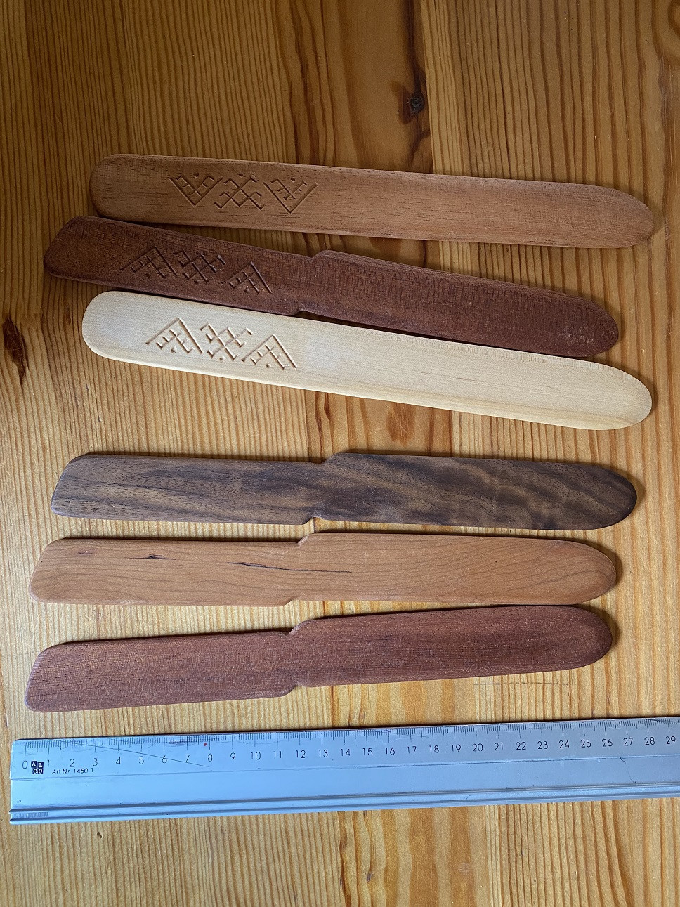 Koka nazīši ir izgatavoti no dažādiem kokiem: sarkankoks, kirsis, riekstkoks, kļava, to garums apmēram 26 (+- 1) cm. Nazīšu cena ar izgrieztu rakstiņu- EUR 10, bez rakstiņa- EUR 5. Tos var izmantot arī kā sviesta nazīšus