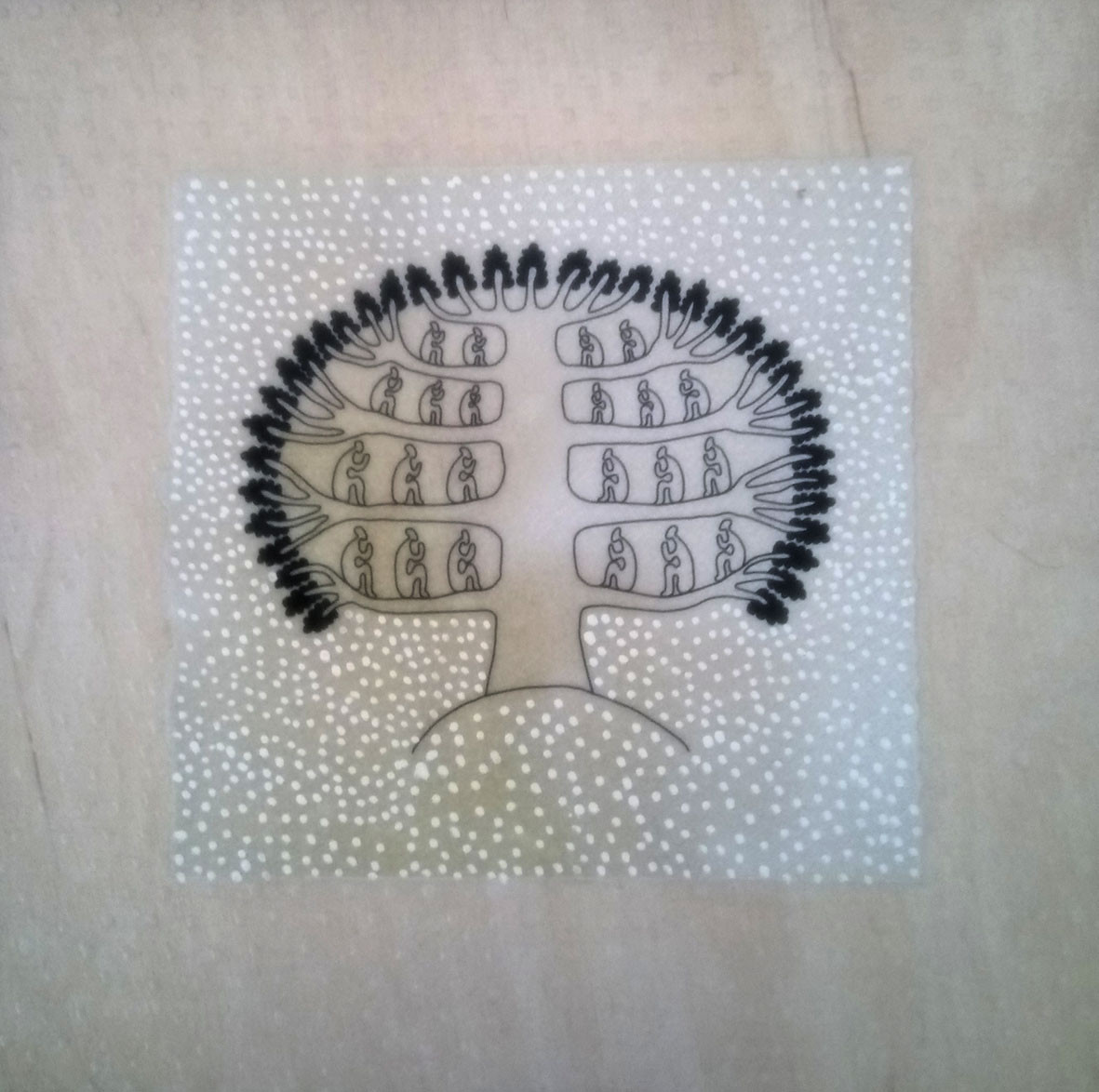 Grafisks zīmējums uzlīmēts uz koka kluča. Dekors uz plaukta vai pie sienas.