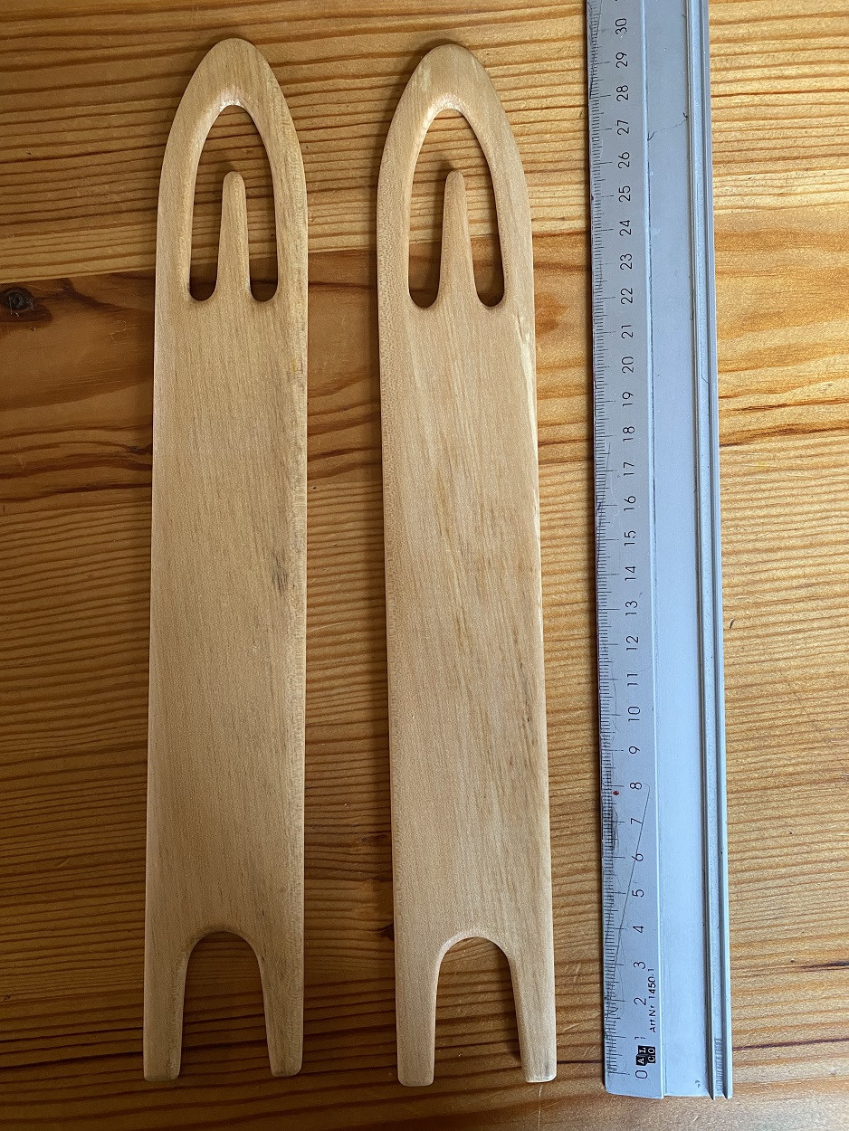 Saiviņu izmērs 29 cm. Tās paredzētas jostiņu aušanai gan uztinot uz tām audu diegu, gan izmantojot kā nazīti piesišanai. Izgatavotas no kļavas.
