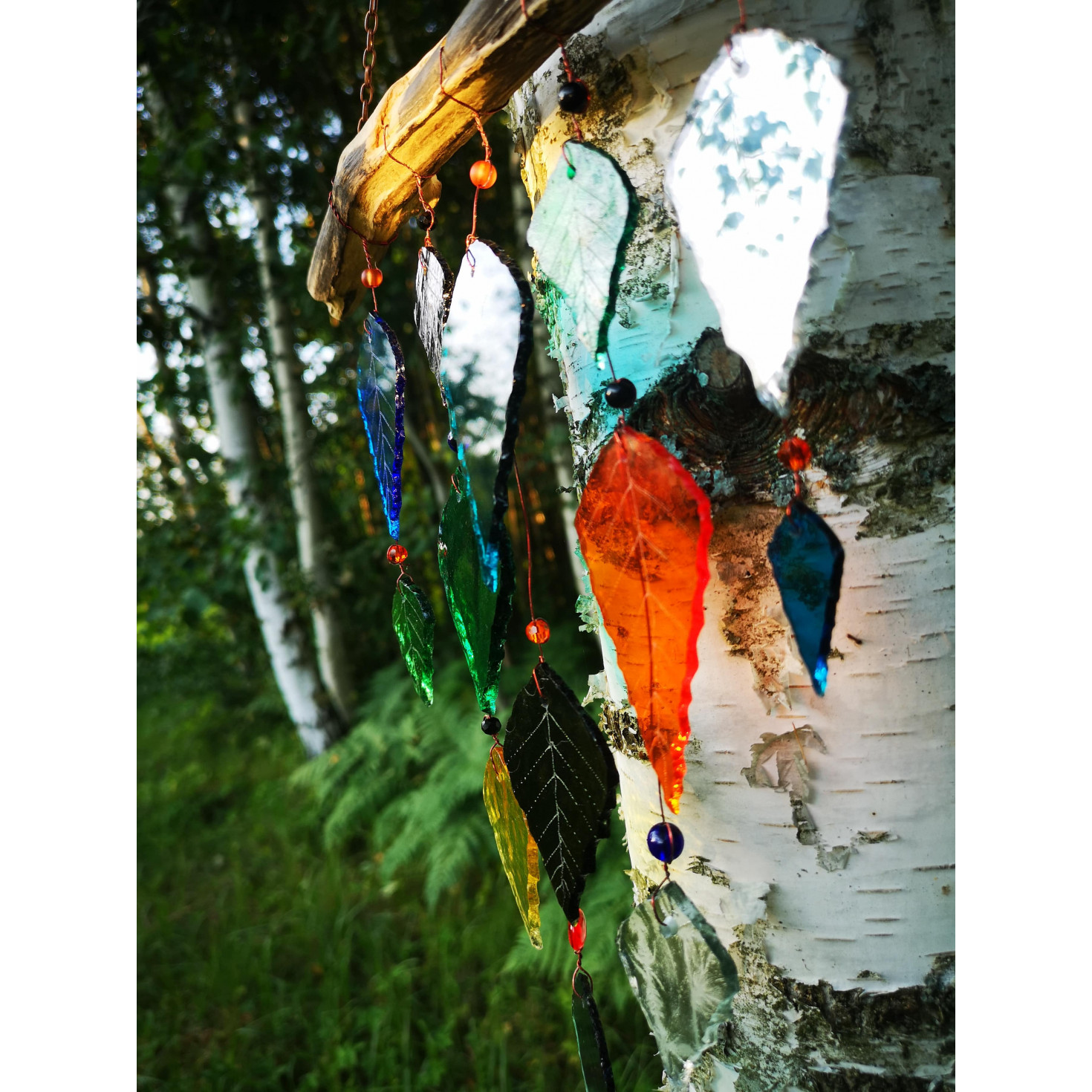 Vēja zvani - saules ķērājs ir izgatavots no vitrāžas stikla un spoguļstikla. Stikla krāsainība un caurspīdīgums lieliski spēlējās ar saules gaismu. Dekors mājai, dārzam, logam. Stikla detaļas, bērza lapiņu formā, vējā rada dzidru zvanu skaņu. Pamatnei izmantots jūras izskalots koks, lapiņas iepītas kapara stieplītēs. Metāla ķēdīte ērtai uzkāršanai. Izmērs: h 30x30cm.šis produkts ir nopirkts, pēc pasūtījuma 2 dienu laikā varam izgatavot līdzīgu vēja zvanu.