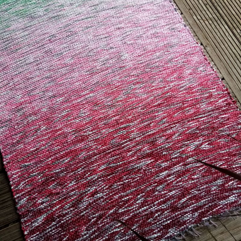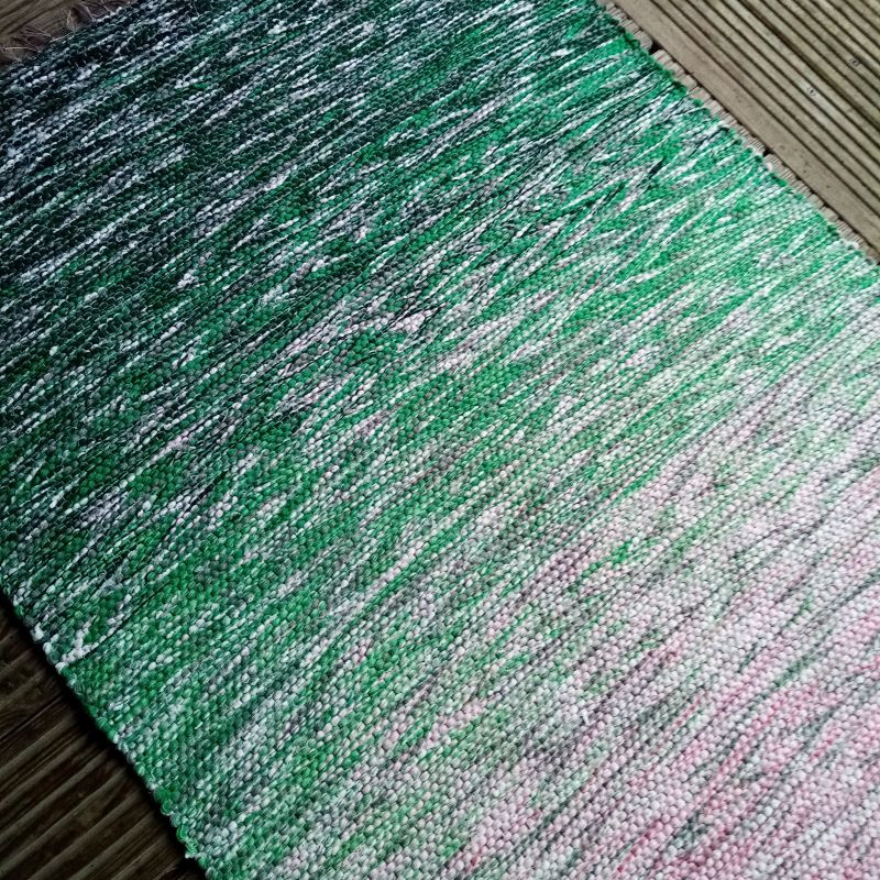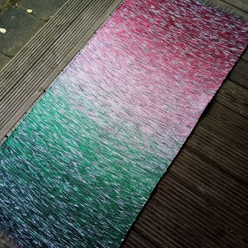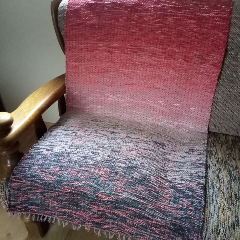 Krāsu pārejā austs celiņš vai krēsla pārklājs ar pirmā sniedziņa noskaņu. Materiāls : otrreiz pārstrādāts tekstils - dzija, diegi. Sniedziņa efektam izmantota arī efektdzija. Izmērs : 1,60 m x 0,73 m.