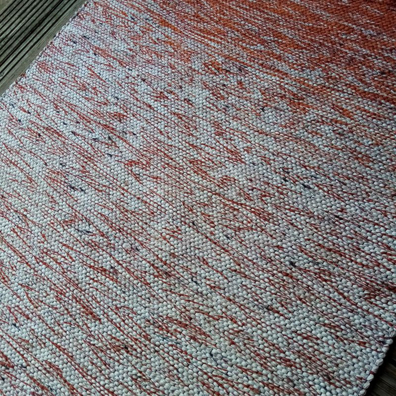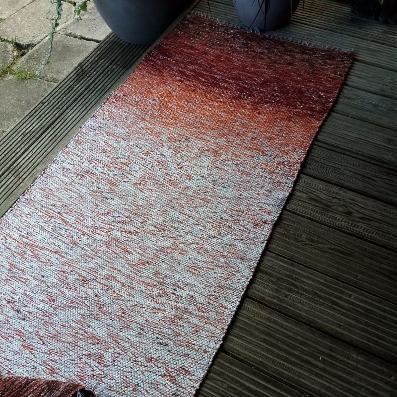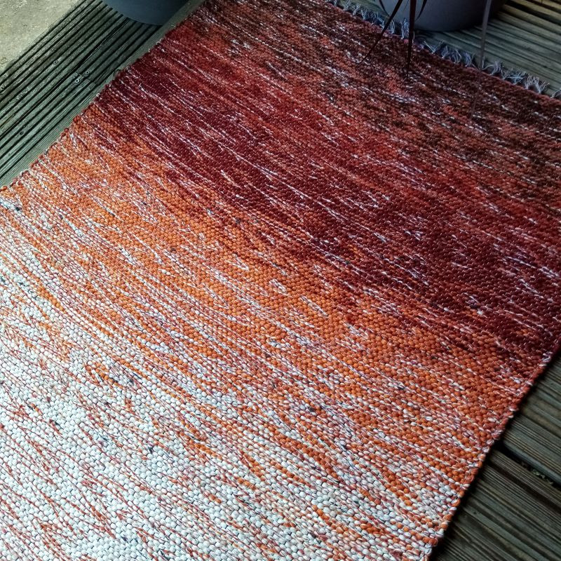 Oranži balts grīdas celiņš no otrreiz pārstrādātiem diegiem kokvilnas velkos. Izmērs : 2,40 m x 0,73 m. #grīdceliņi #austi_grīdas_celiņi #roku_darbs #mājas_tekstils #lupatiņu_paklāji #zero_waste #dizaina_paklāji #otrreizējie_materiali