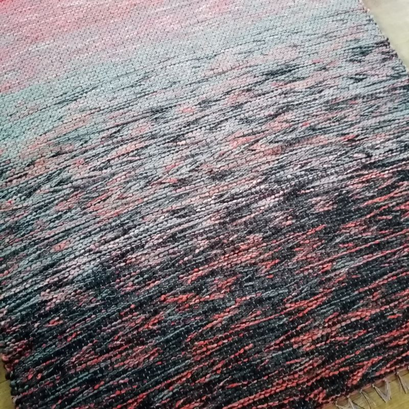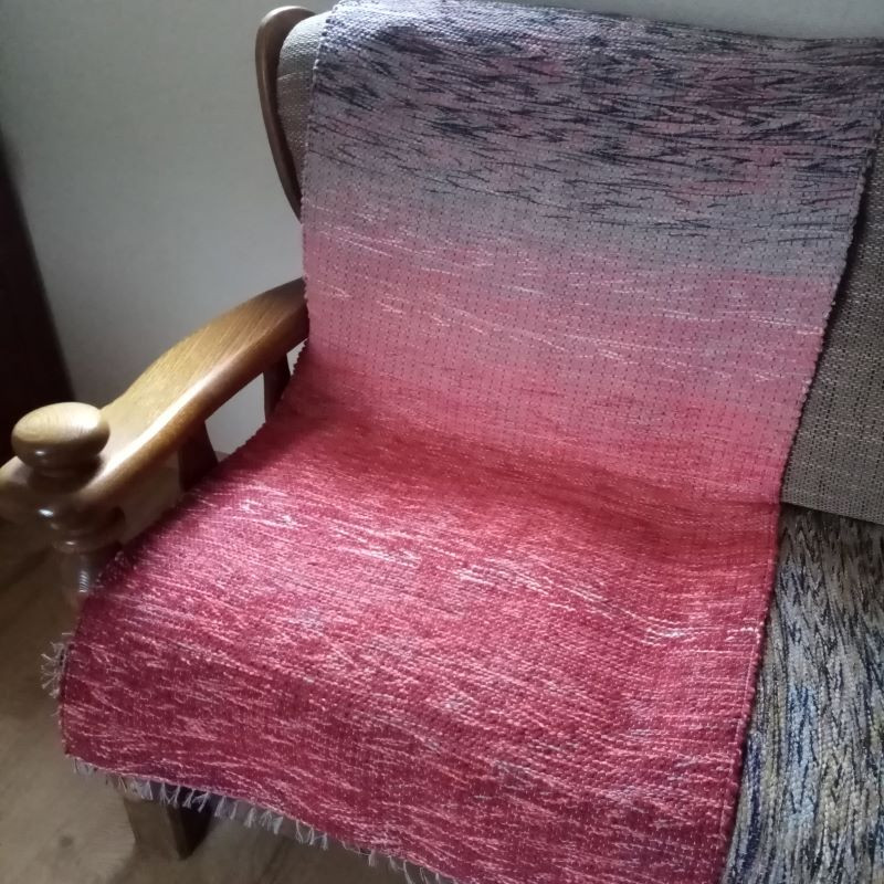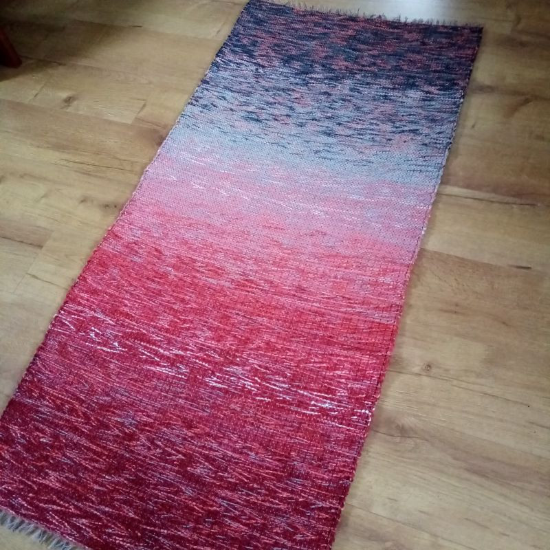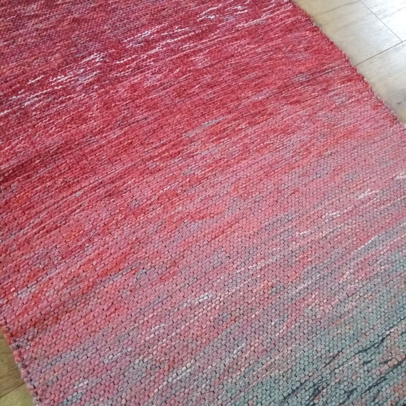 Toņu pārejā no pelēka uz sarkanu austs krēsla pārklājs, izmantojams arī kā grīdas paklājs. Izmērs : 1,58 m x 0,73 m.
