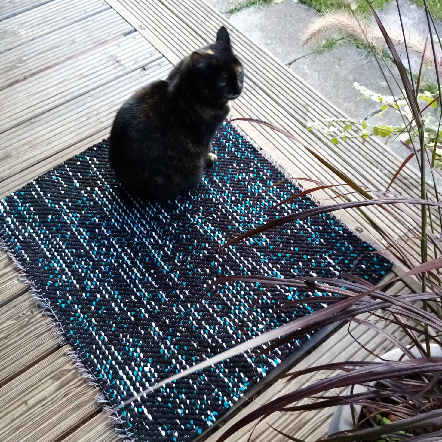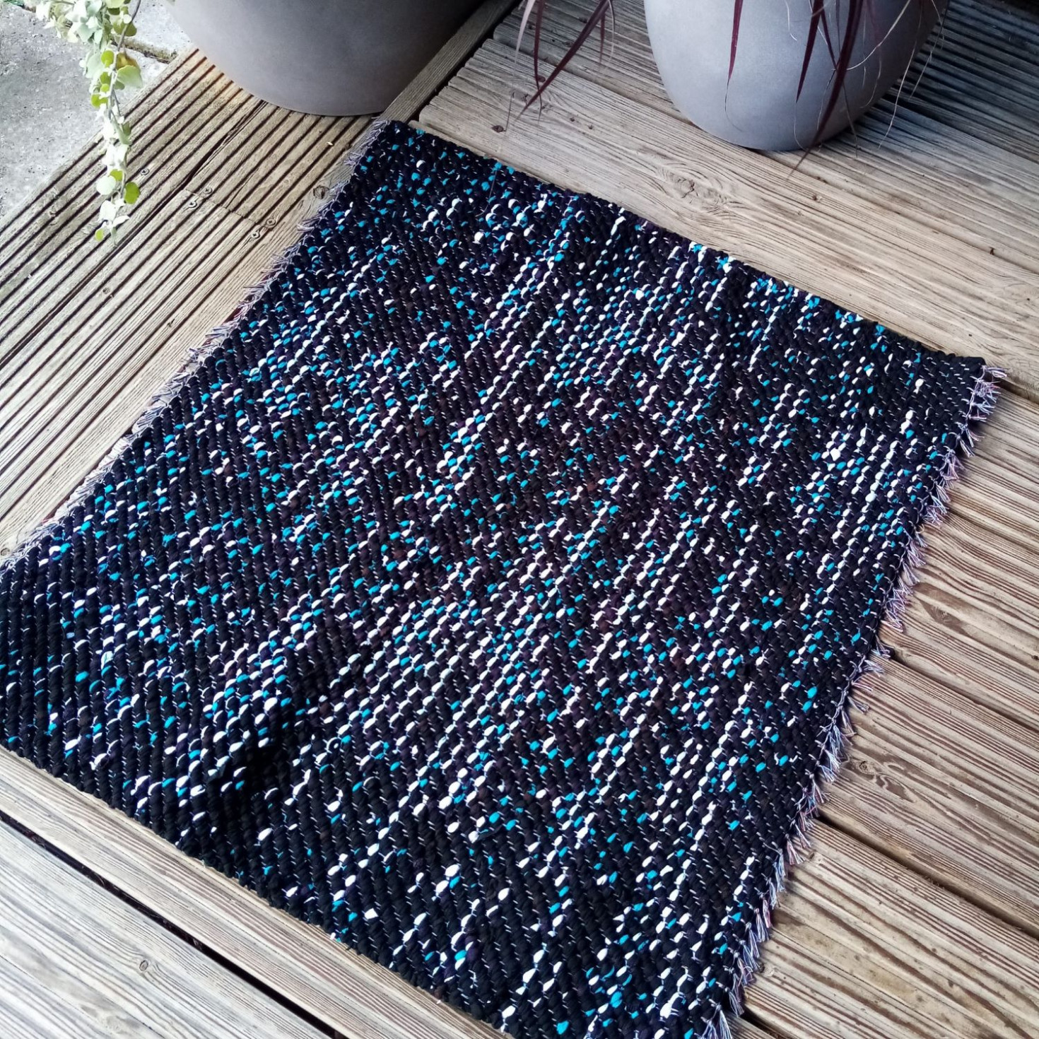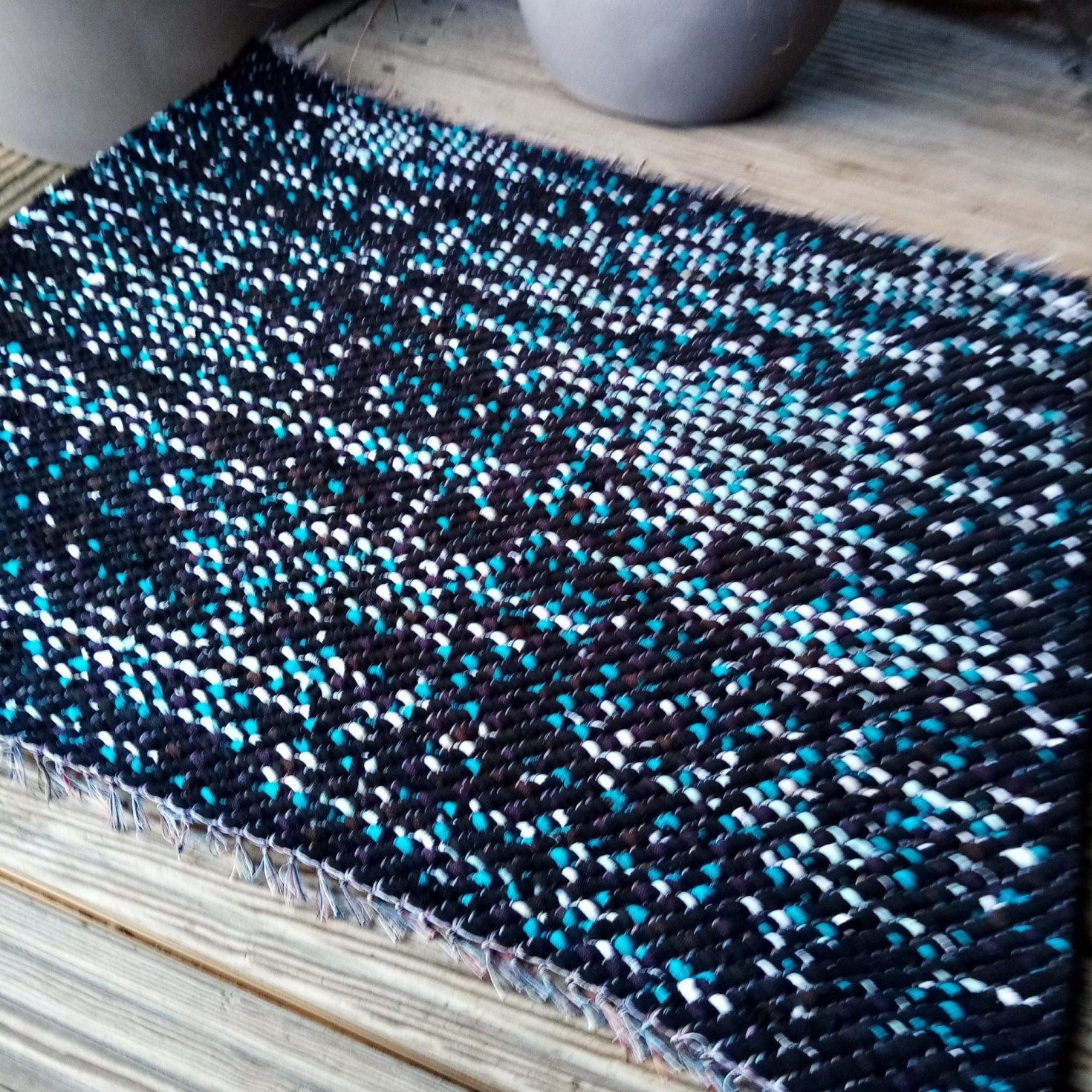 Neliels praktisks paklājiņš. melns ar tirkīza un baltiem raibumiņiem. 0,68m x 0.61m. Sūtu ar omnivu.