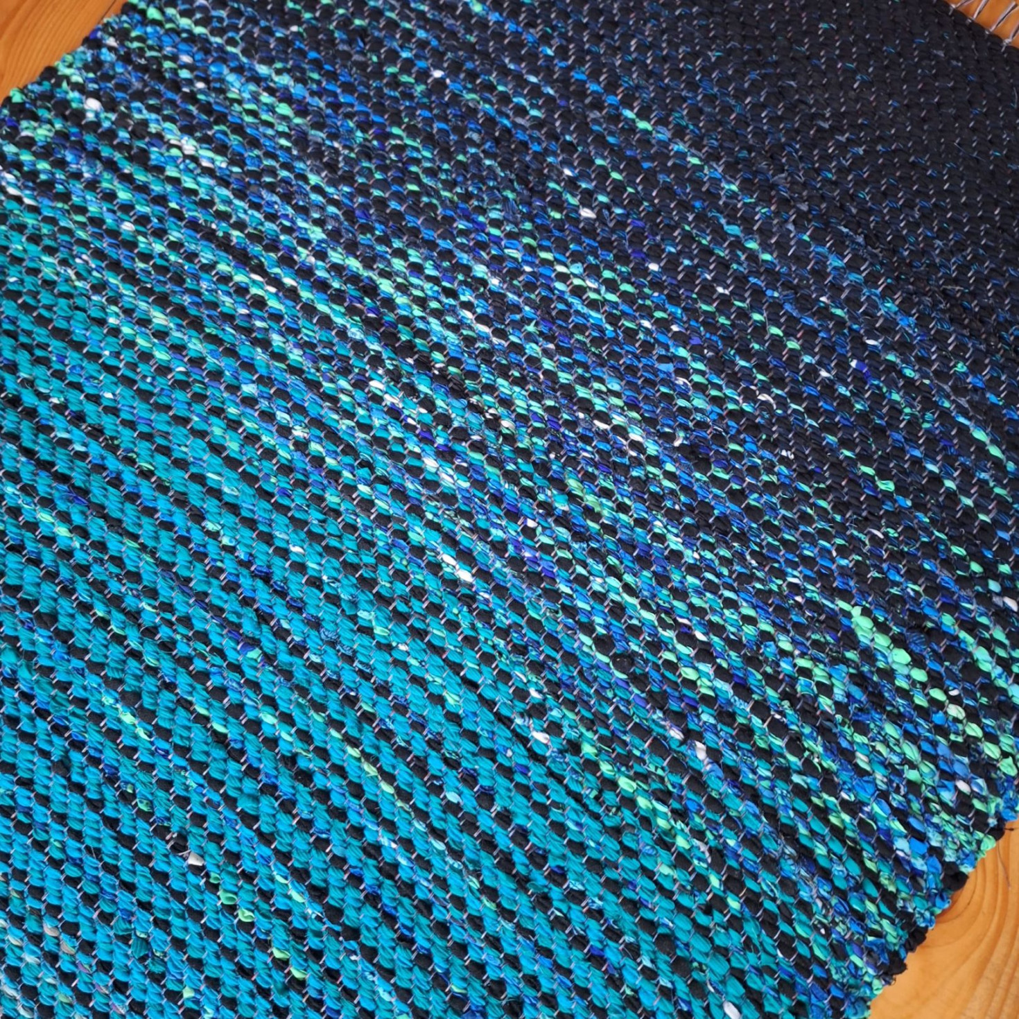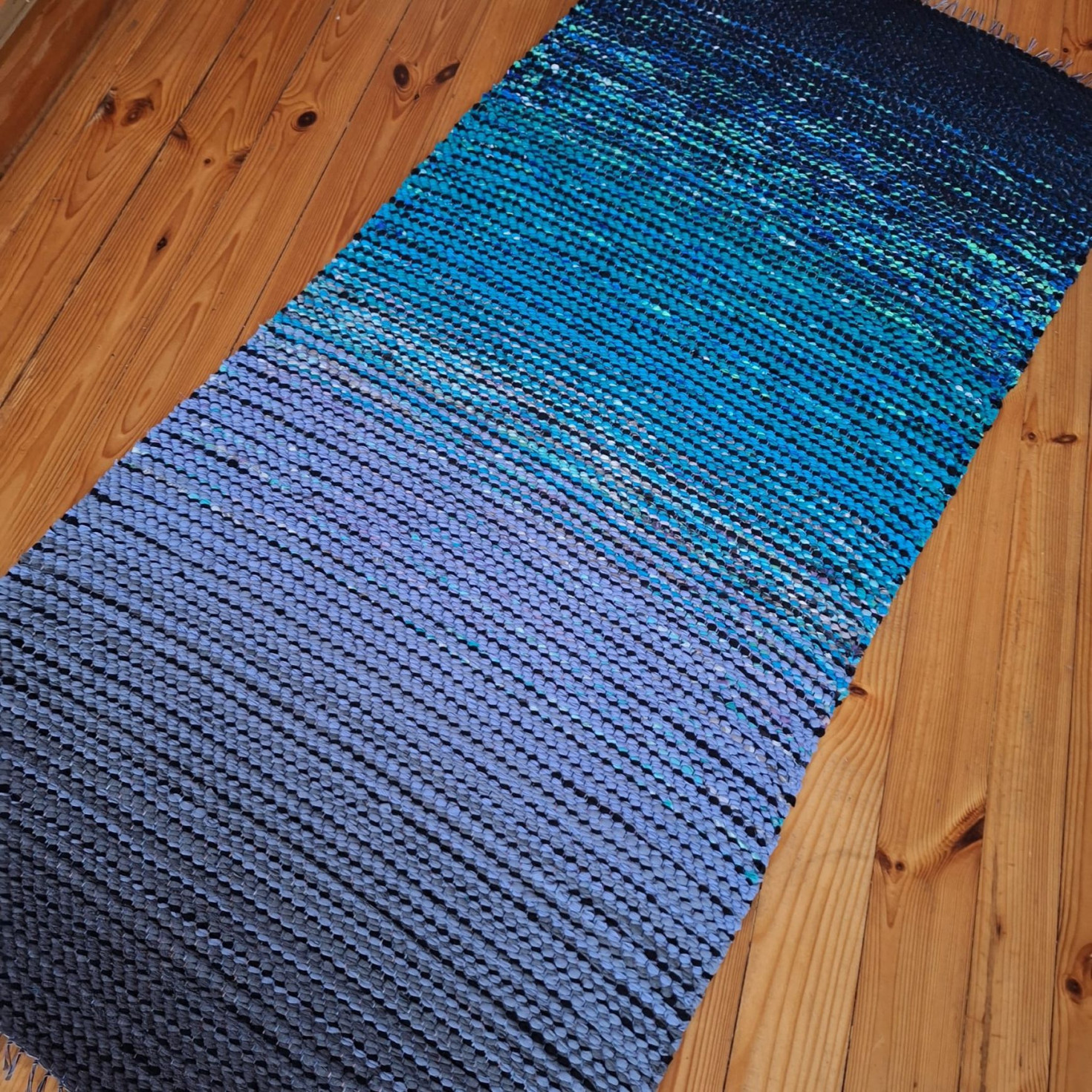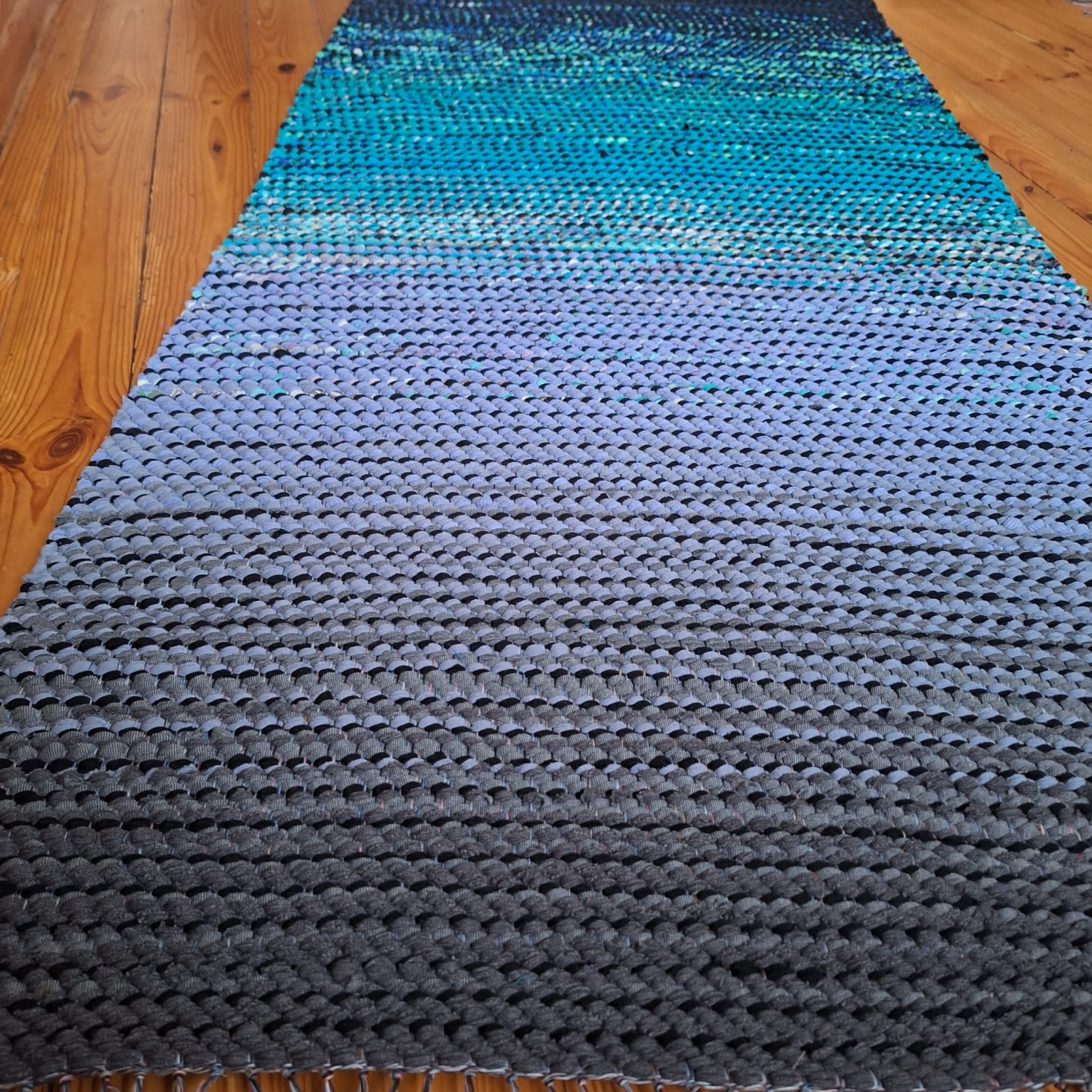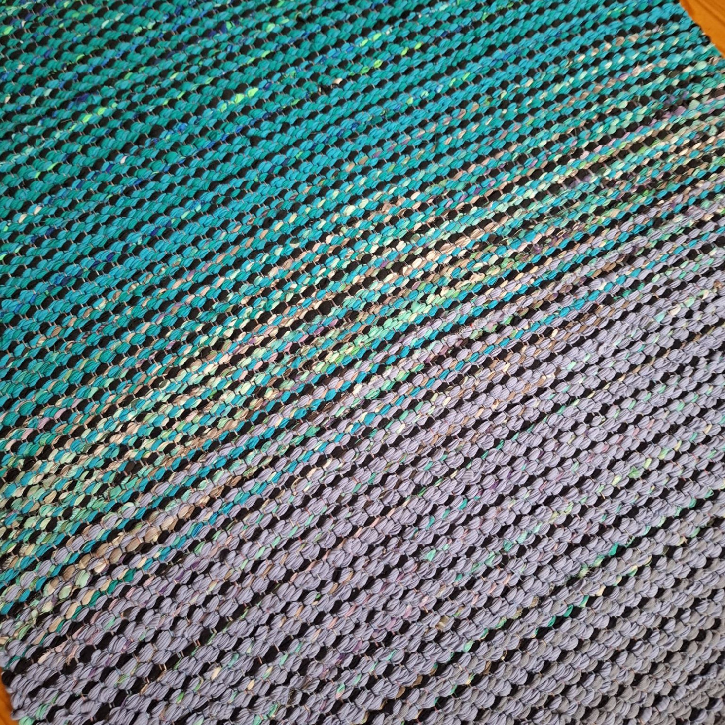 Paklājs- grīdas celiņš zaļgani- ceriņainu toņu pārejās. Austs no pārstrādāta tekstila kokvilnas velkos.