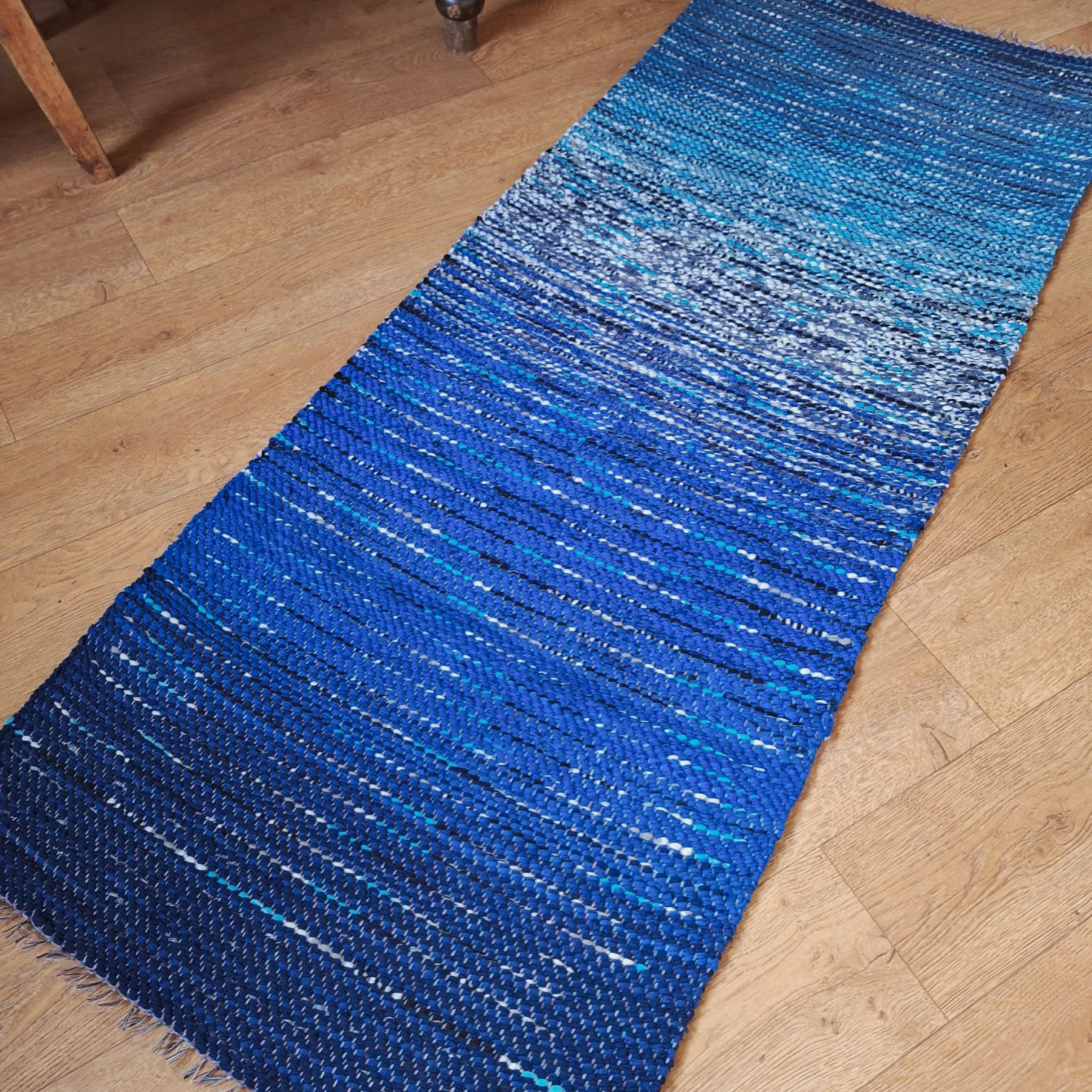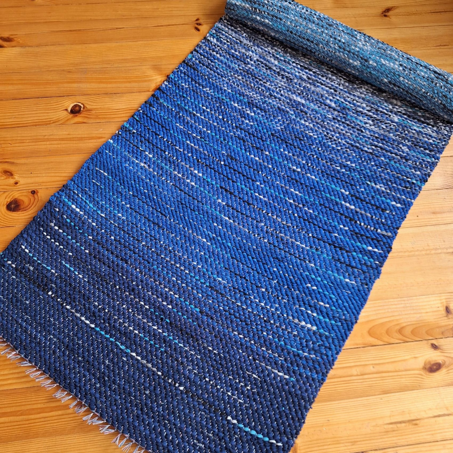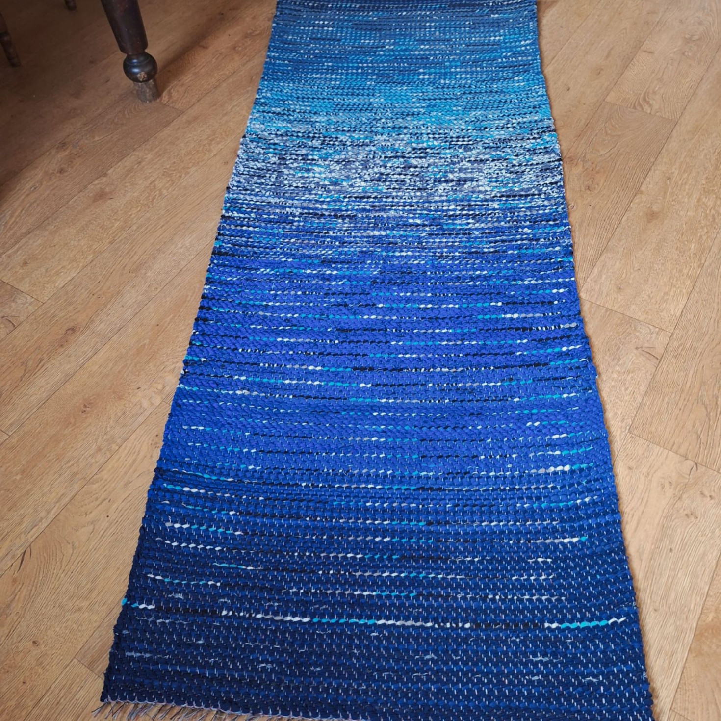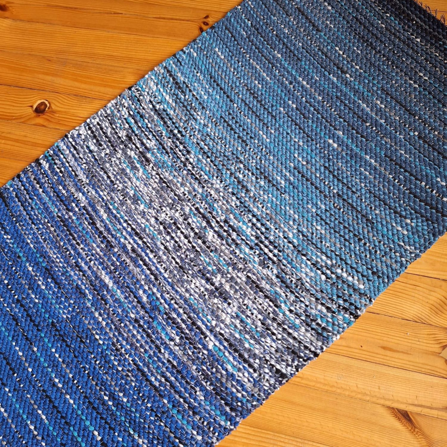 Zili raibās toņu pārejās austs paklājs- grīdas celiņš. Pārstrādāts tekatils, kokvilnas velki. 1.75m x 0.68m. #gridas_celins, #austs_paklajs,#austs_lupatu_paklajs