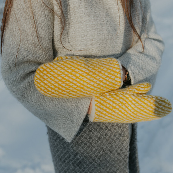 Vilnas dūraiņi dubultie. Dzelteni - divi toņi - dzeltens košāks raksts un dzeltens gaišāks raksts. Izmērs nosakāms izmērot plaukstas platako vietu kopā ar īkšķi. Izmēri S,M,L,Xl