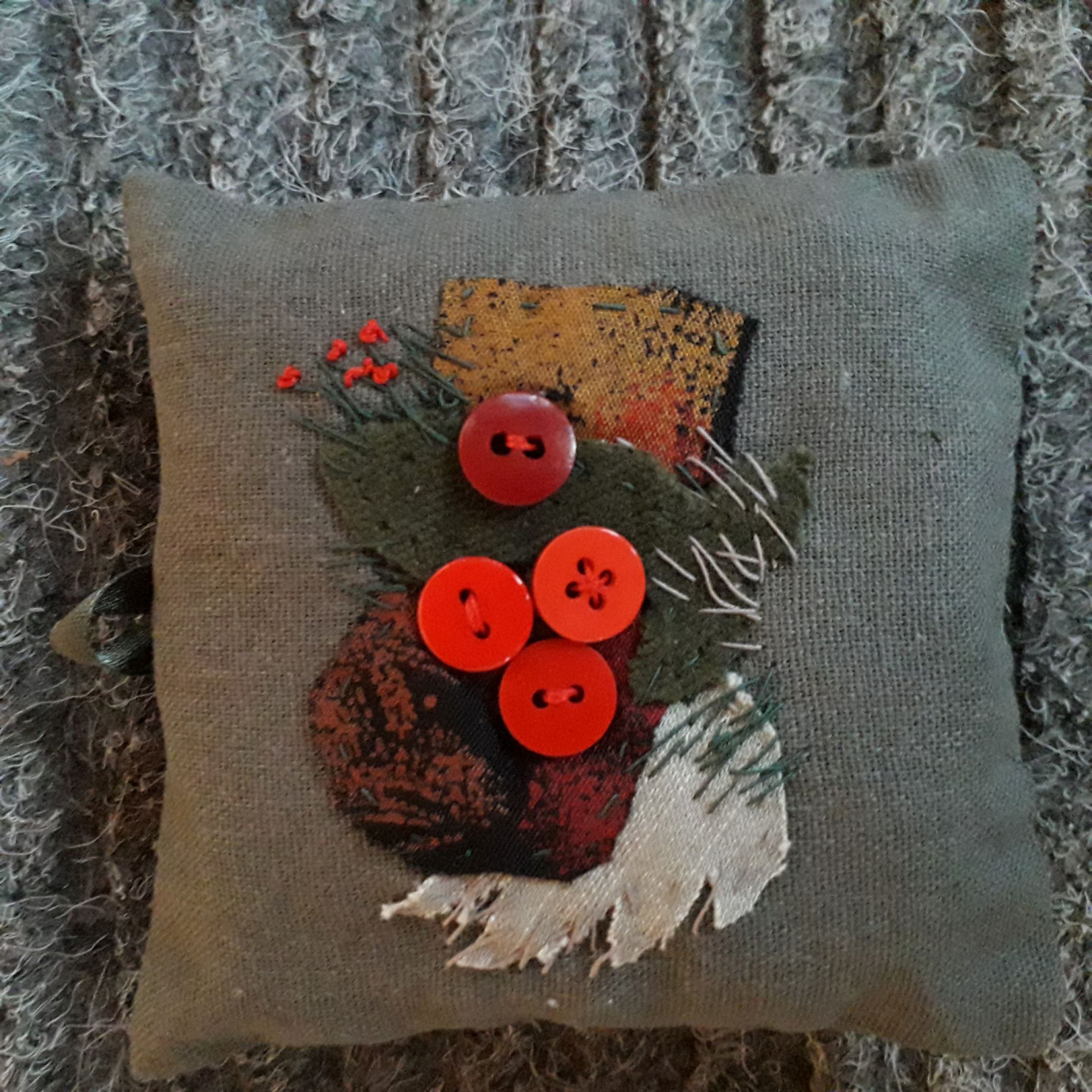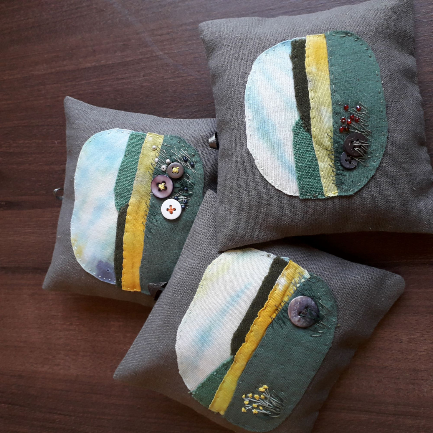 Aplikāciju tehnikā darināti smaržu spilventiņi ar lavandas un piparmētru aromātu. 10-11cm