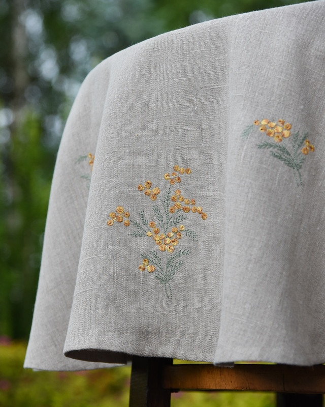 Apaļš lina auduma galdauts ar smilšērkšķa zariņu izšuvumu visapkārt malai - gan romantiski, gan eleganti, taču vienmēr svinīgi! Krāsa: dabīga lina pelēna vai piena balta. Galdauta diametrs: 140 cm. Audums pirms šūšanas un izšūšanas mazgāts - galdauts nemainīs formu pēc mazgāšanas. Kopšana: drīkst mazgāt veļas mašīnā - saudzīgā mazgāšanas režīmā, ne vairāk kā 40'C temperatūrā. Mazgāšanas laikā nelietot hloru saturošus balināšanas vai traipu tīrīšanas līdzekļus. Drīkst gludināt. Pasūtīt varat: http://sanpo.lv/lv/store/lins-galda-klajumam/apa%C4%BC%C5%A1-balta-lina-galdauts-ar-smil%C5%A1%C4%93rk%C5%A1%C4%B7a-iz%C5%A1uvumu-detail