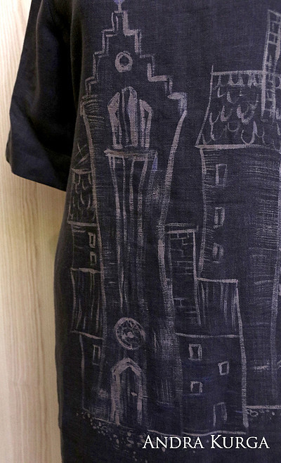 Lina kleita ar pilsētas motīvu. Materiāls: lins, vilna, satīns. Izmērs: M. (Garums: 150 cm, Krūšu apkārtmērs: 95cm, Gurnu apkārtmērs: 140 cm). Kleitu iespējams uzmērīt pie manis darbnīcā Jelgavas rajonā, Svētē .Iespējams pasūtīt savu sapņu kleitu pēc individuālām vēlmēm.