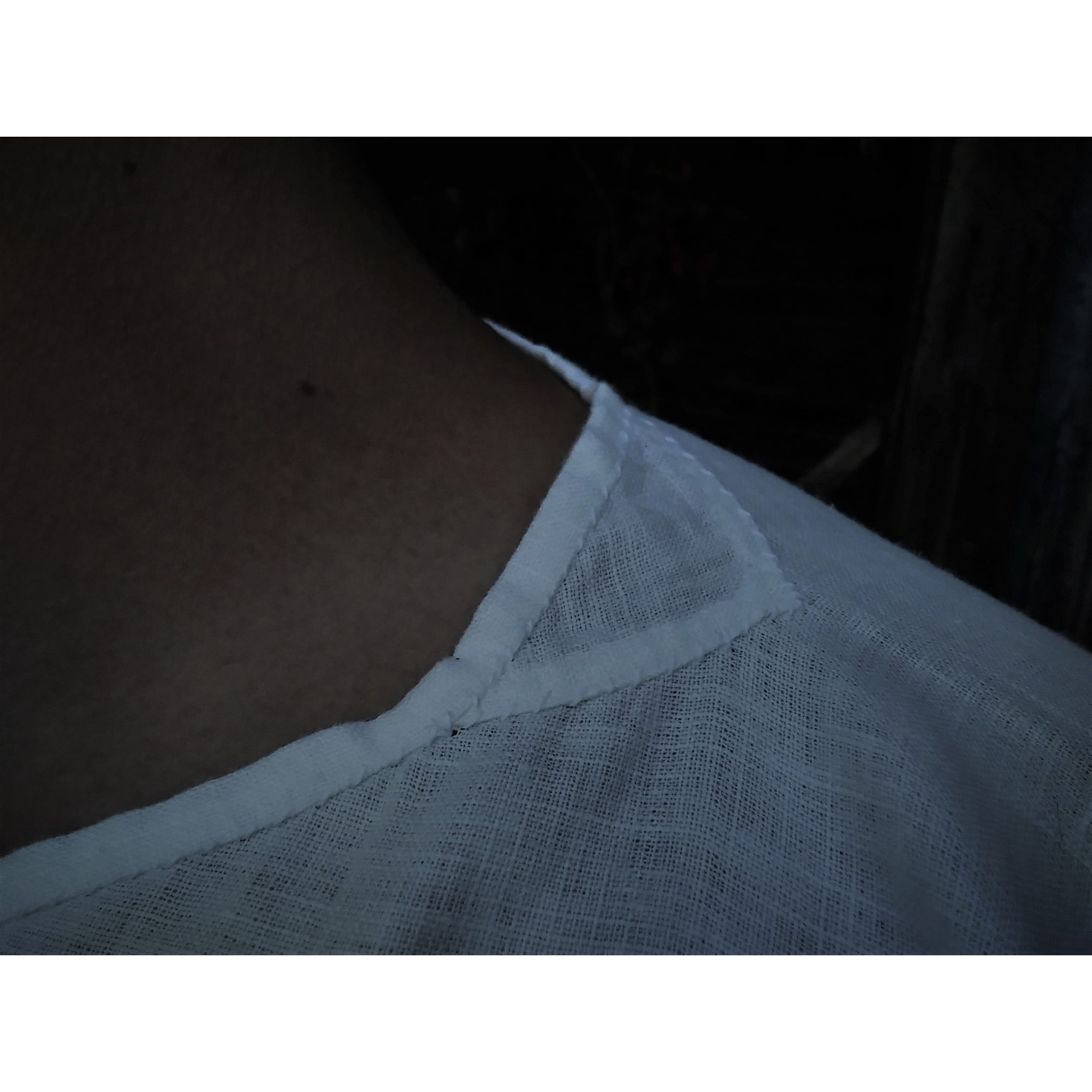 Puišu krekls senajam (arheoloģiskajam) tērpam un dzīvei. Lins, mazgāts un vairs nesarausies, dabiskos toņos. Apkakle, dūrgali, apakšmala šūti rokām, neredzamajām daļām - ar šujmašīnu veļas vīle. Veiksmīgākam iznākumam iespējams pasūtīt pēc individuāliem mēriem un pielaikot. Tradicionāla tunikveida piegrieztne ar ķīļiem. Piešūta apkalīte. Nēsājams virs biksēm, ar jostu vai vamzi, aizspraužams ar saktu. Izmērs L; piena baltā krāsā.