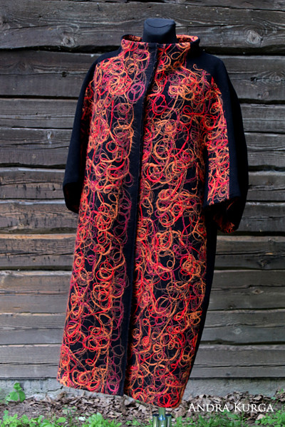 Filcēts pusgaro piedurkņu vilnas mētelis. Izmērs: L/XL (Garums: 110cm, Krūšu apkārtmērs: 125cm, Gurnu apkārtmērs: 130cm). Mēteli iespējams uzmērīt pie manis darbnīcā Jelgavas rajonā, Svētē kā arī iespējams pasūtīt mēteli pēc individuālām vēlmēm.