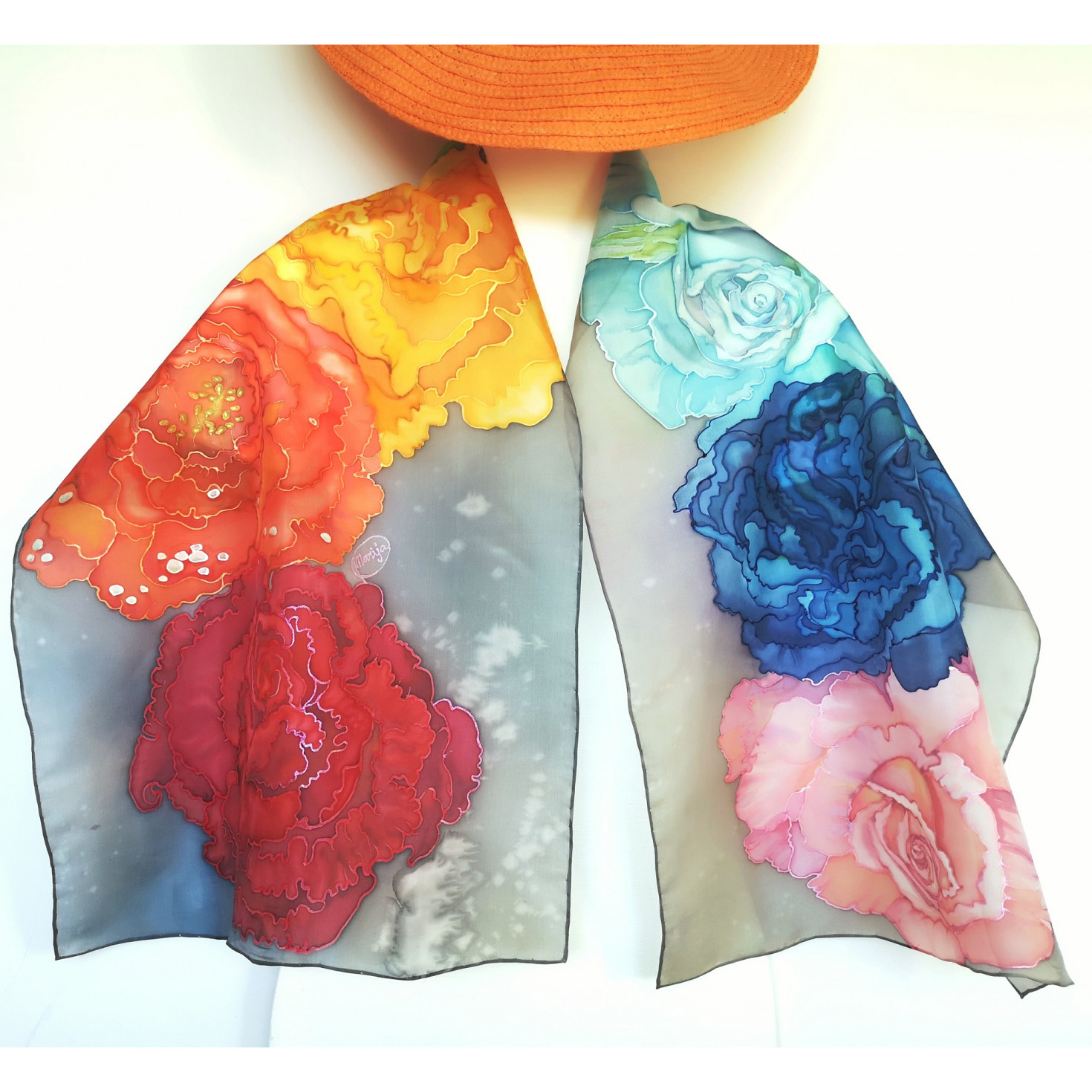 ir plata 45cm un 140cm gara, krāšņa - septiņās varavīksnes vai 7. čakru krāsās mirdzoša plecu šalle no viegla un gaisīga zīda. Neitrālais iepelēkais fons labi ļauj izcelties katrai īpašajai rozes krāsai. Roze- sens sievišķības simbols. Vitāla, priecīga dāvana kā aksesuārs pie visu krāsu apģērbiem vai telpas dekors skaistumam un meditācijai.