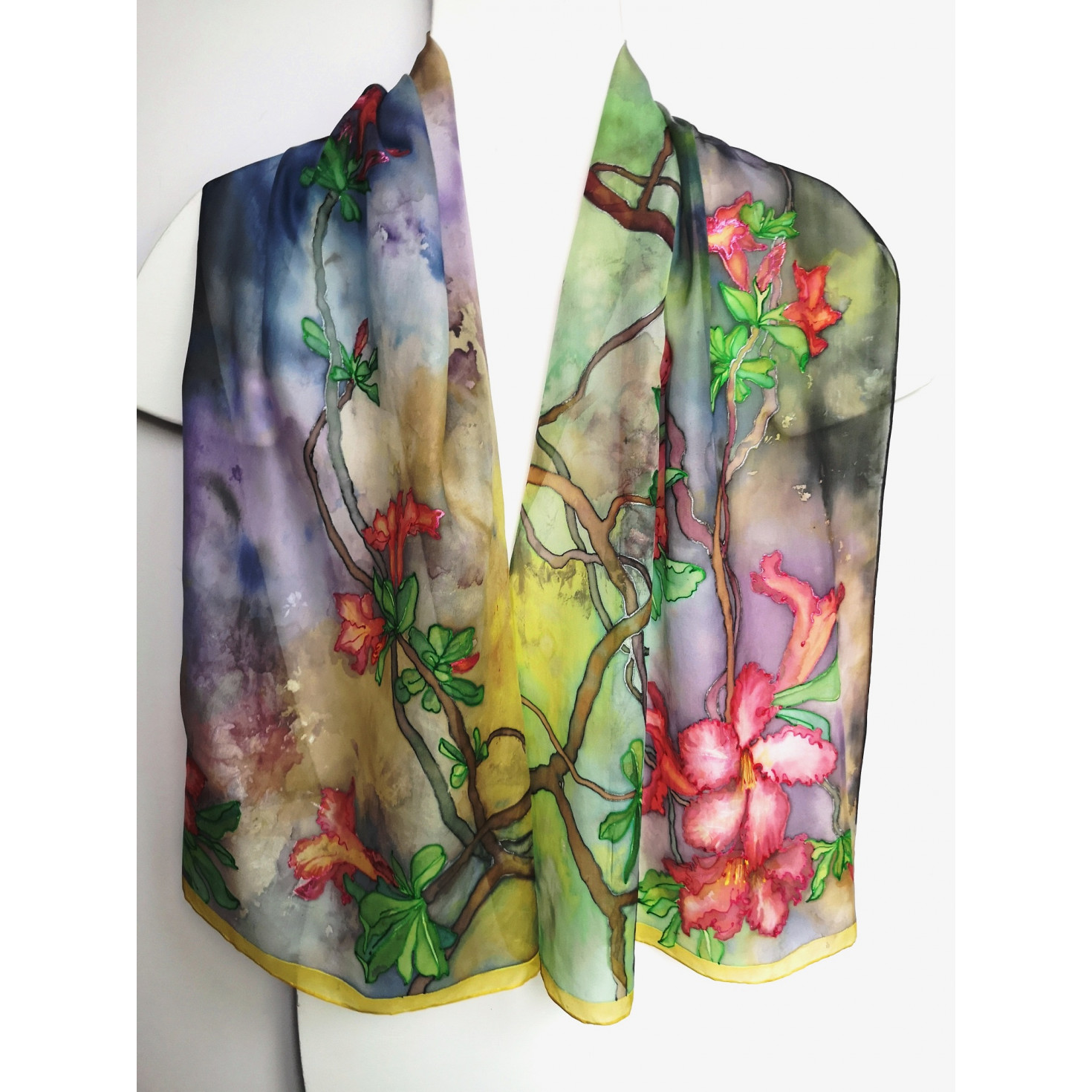 100% zīds, roku darbs. Šie košie, kā asins lāses sarkanie Izraēlas tuksneša ziedi iztur smilšu vētras, karstumu un slāpes... savos stumbros uzkrāj mitrumu un lepni un skaisti uzzied smiltīs. Ja jums vajag spēku izturēt dzīves vētras un ziedēt, saglabājot stāju, atcerieties par tiem. Daba mums māca, kā ieraudzīt zeltainu maliņu aiz vēja saceltiem putekļiem. Ja vēlaties, varu atkārtot zīmējumu ļoti tuvu oriģinālām, izmainīt krāsas, lielumu, materiālu. Pēc individuāla dizaina varu apgleznot apģērbu, aizkarus, dekorus vai ierāmējamu gleznojumu pēc abpusējas vienošanās.